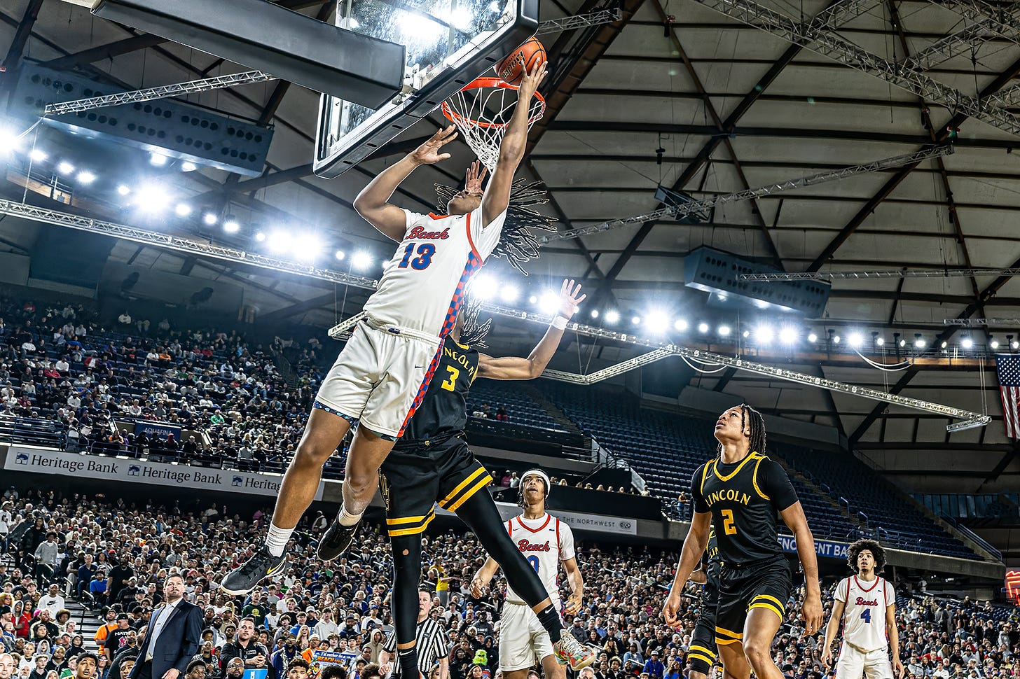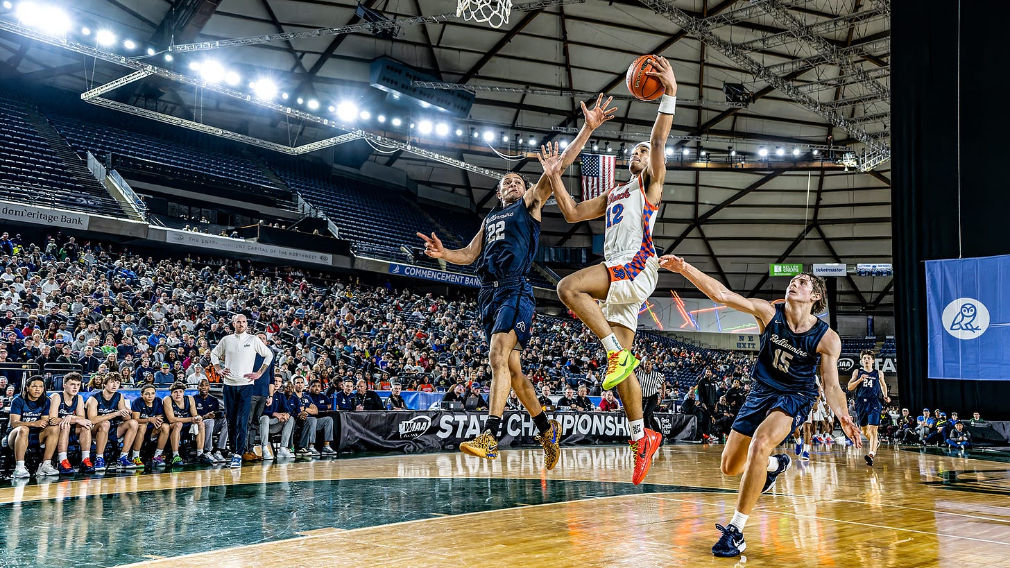 I can’t imagine the crowds and media in New Jersey (The Throne) or Indiana (Chipotle) not falling in love with Vikings Micah Ili-Meneese and Kam Babbs the way everyone did at the Tacoma Dome. Ili-Meneese, or “Micah Jordan” to his fans, fulfilled long-prophesized overall greatness during the state tournament, and Babbs showed he was more than a high-wire act. Achilles Reyna had his best game in the championship and has the size, athleticism, and inside-out game that will have college scouts drooling.